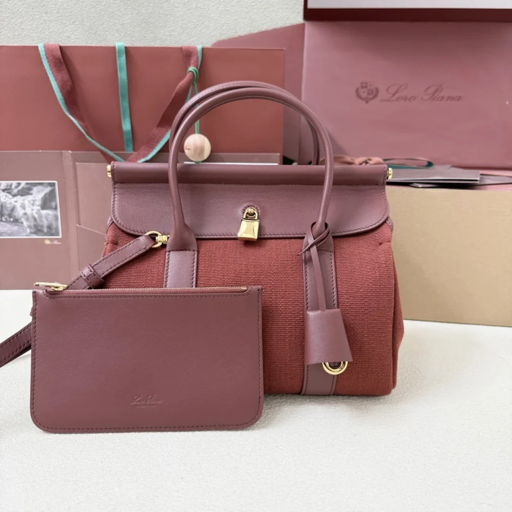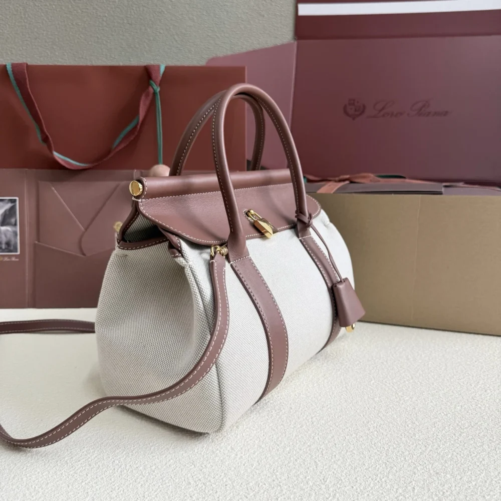 $379.00Original price was: $379.00.$349.00Current price is: $349.00.The Loom bag pays homage to Loro Piana’s centuries-old textile heritage, with the metal bar beneath the flap evoking the gentle cascade of fabric draped across an artisan’s loom – a subtle nod to the brand’s storied weaving techniques. Beautifully crafted in cotton and linen canvas, the refined padlock that closes the bag can be unfastened, giving it a more relaxed look. Loom can be worn closed or open without losing charm and personality. Even when worn unfolded, the bag gracefully closes by itself. The bag can be carried crossbody.