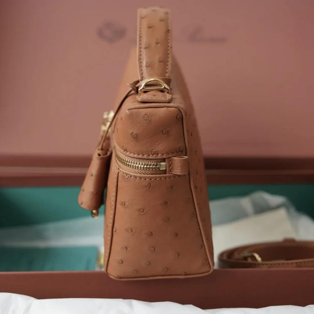 An elegant accessory with compact proportions, the Extra Bag L23 combines timeless style with functionality. Primed for special occasions and everyday elegance alike, it is rendered in exclusive ostrich leather for ultimate sophistication. Suspended from the double-zip close are Loro Piana’s iconic charms, framed by a refined key holder.
