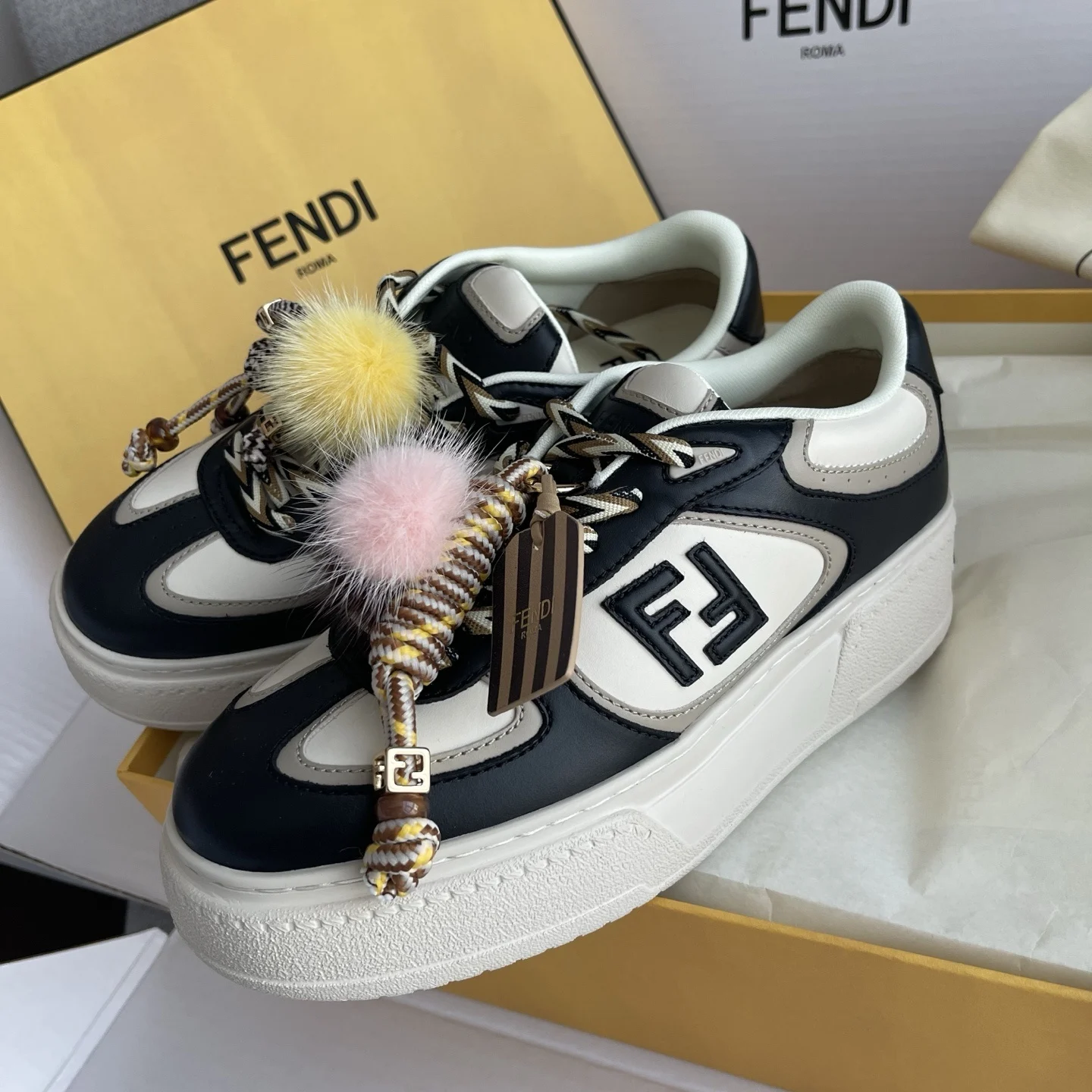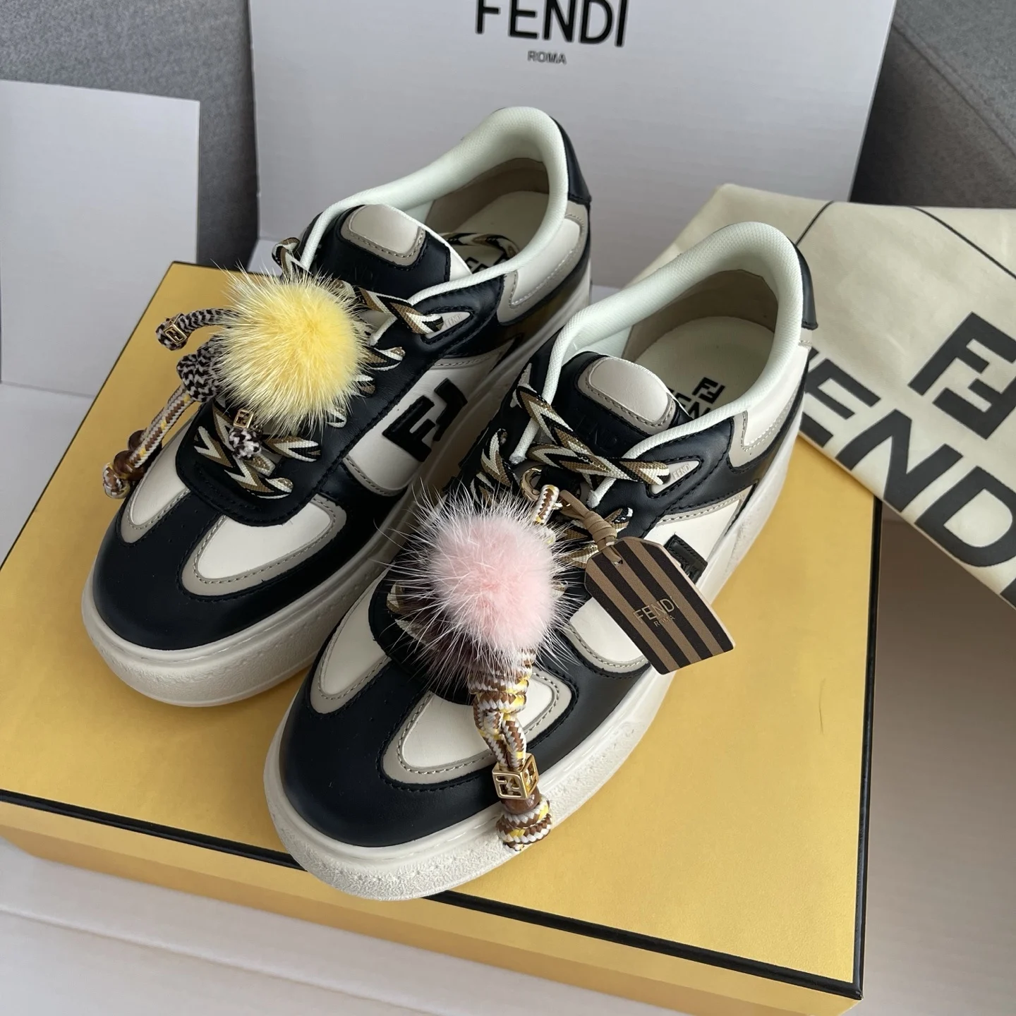 Fendi Match lace-up trainers. Made of black and white leather. Black leather FF appliqué on the sides and multicolour laces. Rubber platform sole with oversized, embossed Fendi lettering at the back. Completed with charms attached by a metal ring onto the tongue: the right shoe is adorned with a small doll in braided cord with yellow mink details and bracelets with FF motif in gold metal. On the left shoe is a braided cord scoubidou with contrasting mink double pom-pom, completed by a metal FF bead, and tag with printed Pequin motif and logo.