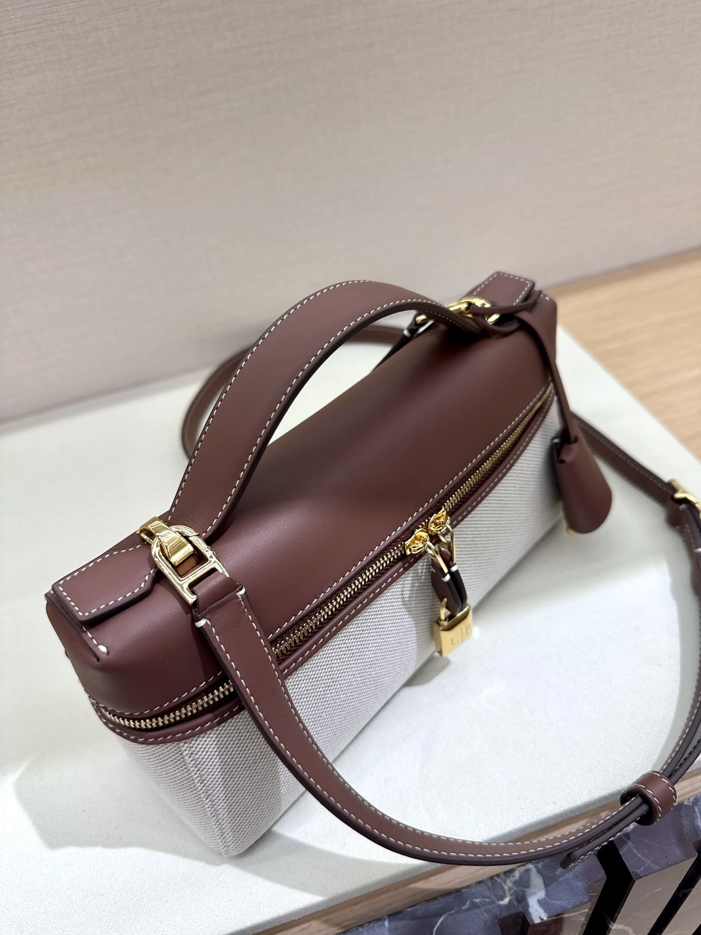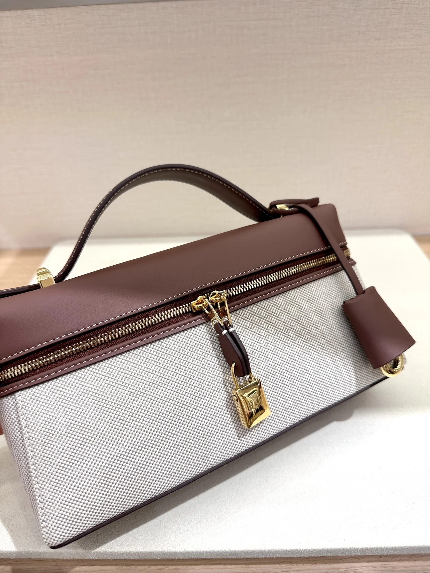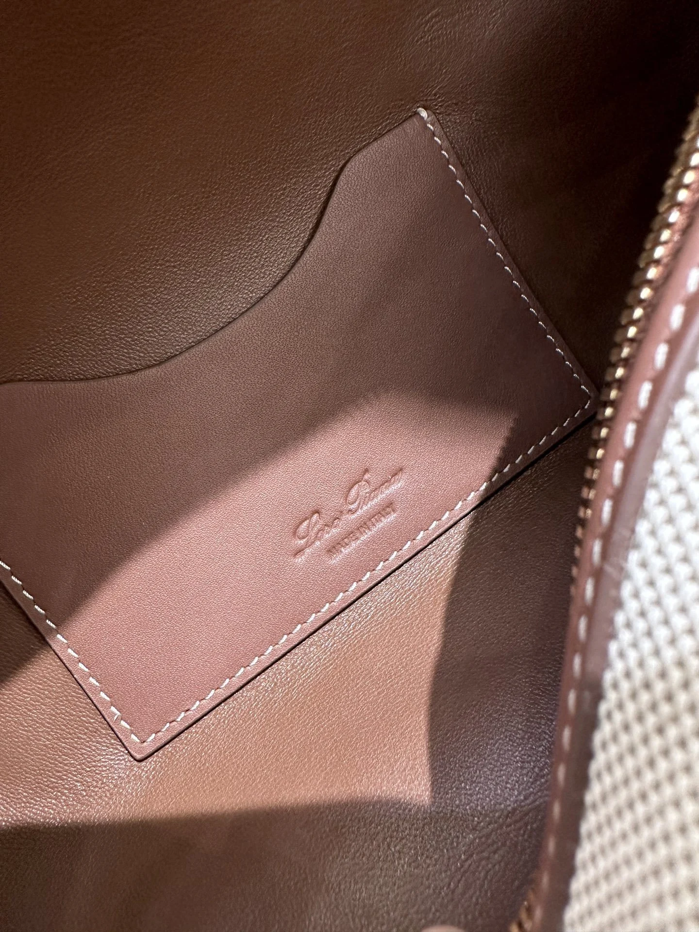 An elegant accessory with compact proportions, the Extra Bag L23 combines timeless style with functionality. Primed for special occasions and everyday elegance alike, it is crafted from Irish silk tweed with Rounded Leather accents. Suspended from the double-zip closure are Loro Piana’s iconic charms, framed by a leather key holder featuring a Ghiera detail.