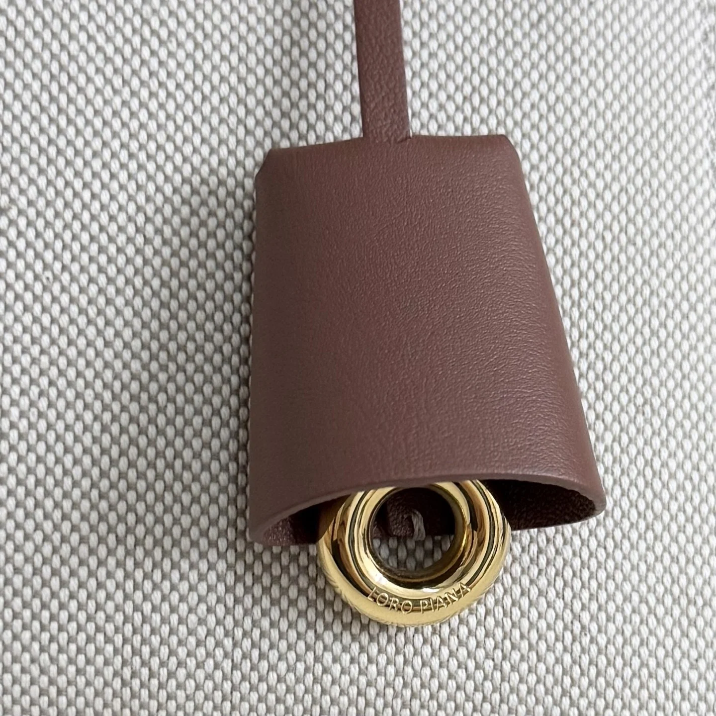 Leather pocket inside featuring the new signature press stud in the shape of the Loro Piana ring, with laser-engraved logo