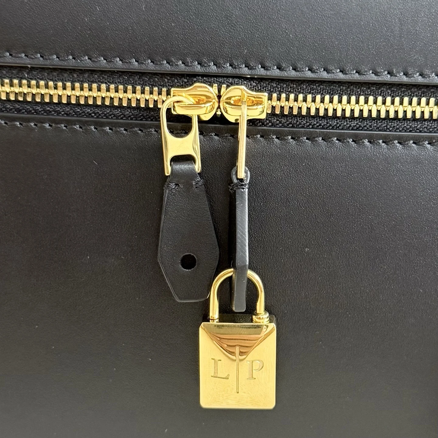 Two detachable, interchangeable, three-dimensional charms are included: a padlock reinforces the zipped closure, while the other is found inside the leather keychain