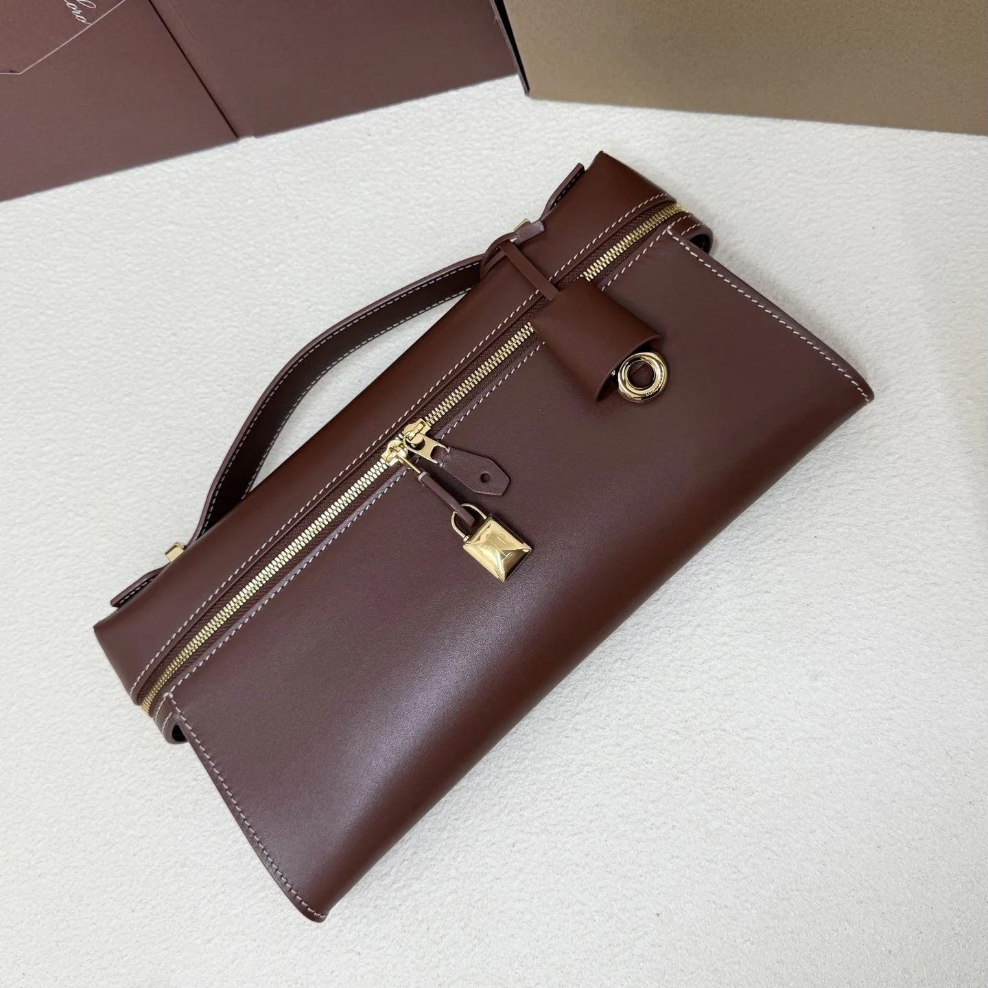 An elegant accessory with compact proportions, the Extra clutch L29 is primed for special occasions and everyday elegance alike. It is rendered in Saddle Leather with a smooth, full-bodied touch and signature topstitching. Suspended from the double-zip close are Loro Piana’s iconic charms, framed by a refined leather key holder.