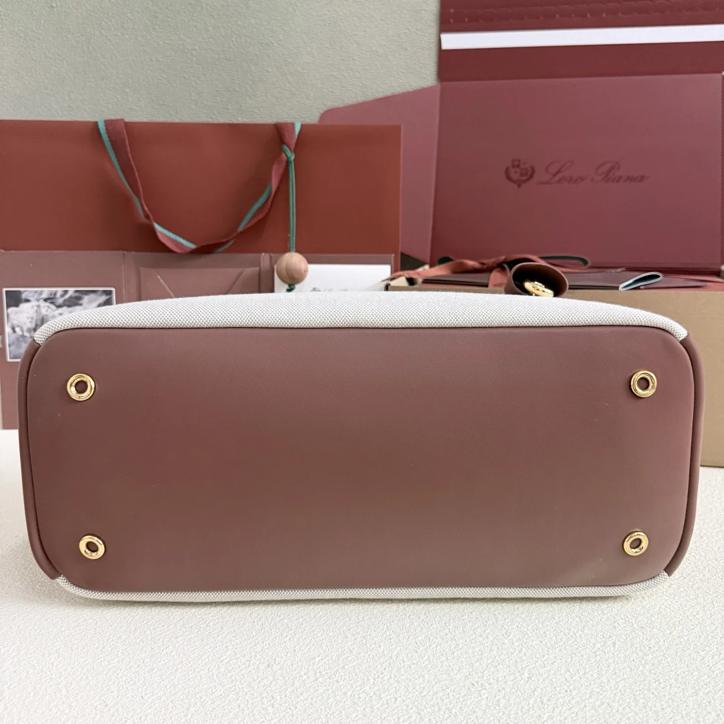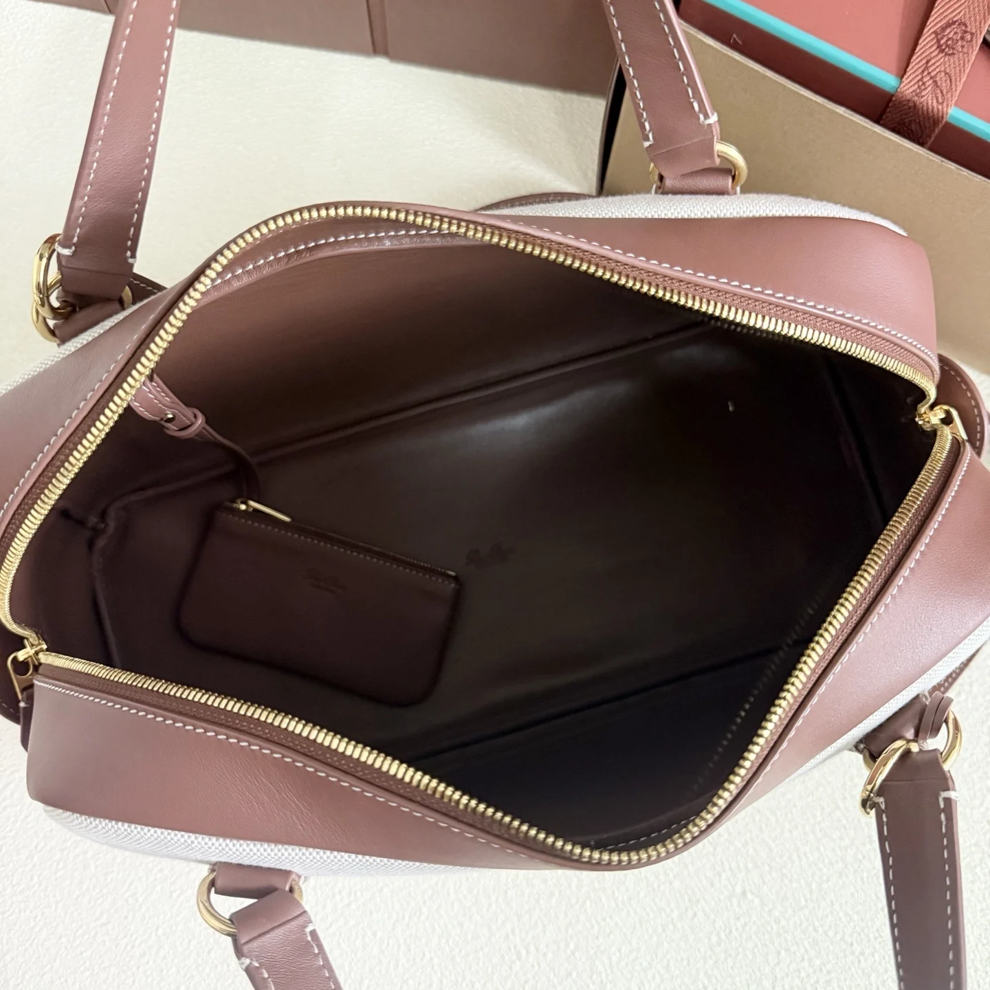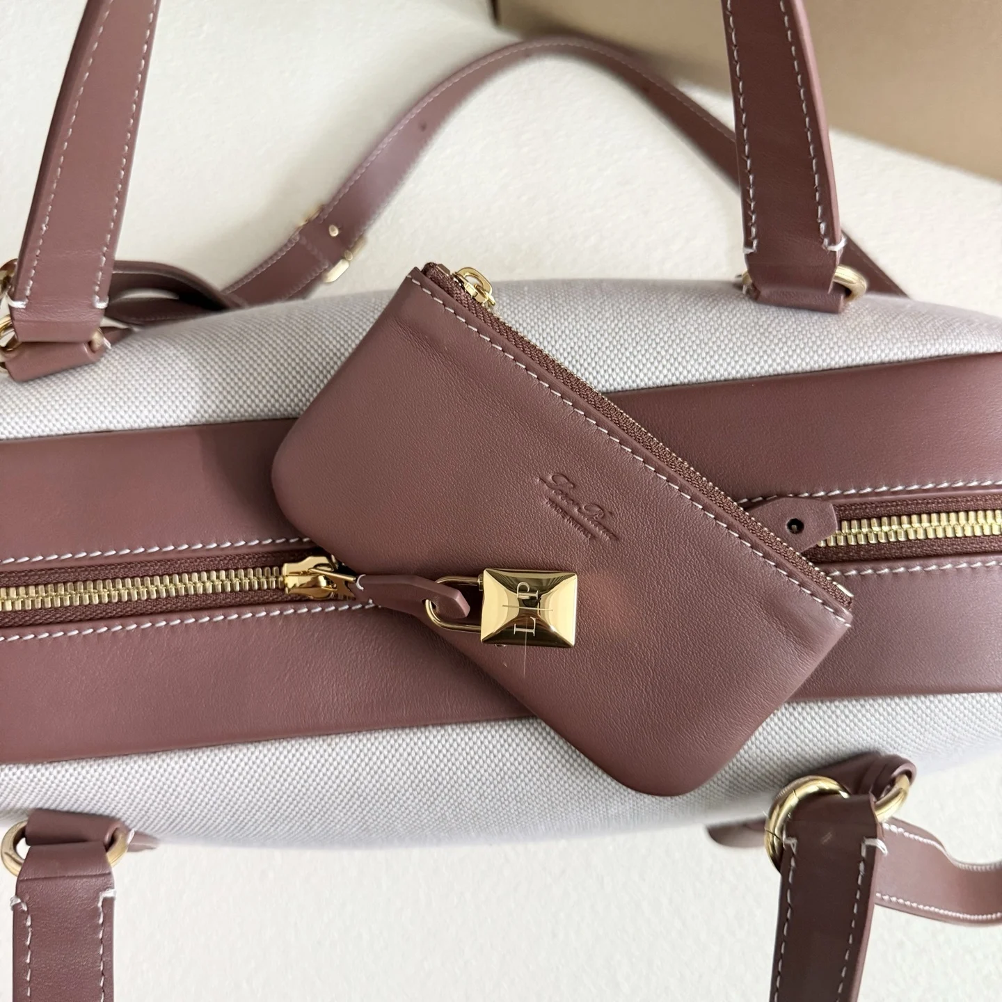 Here presented in a medium size, the Needle is a Loro Piana interpretation of the bowling bag, complete with the iconic LP charms. Evoking the Maison’s textile heritage, it is inspired by the bags used to carry knitting needles. It is constructed with soft, sinuous lines, allowing for versatile wear over the shoulder or in hand. Crafted from cotton and linen canvas with a velvety suede lining, it has a harmonious silhouette and is made with a single piece of leather along the sides.