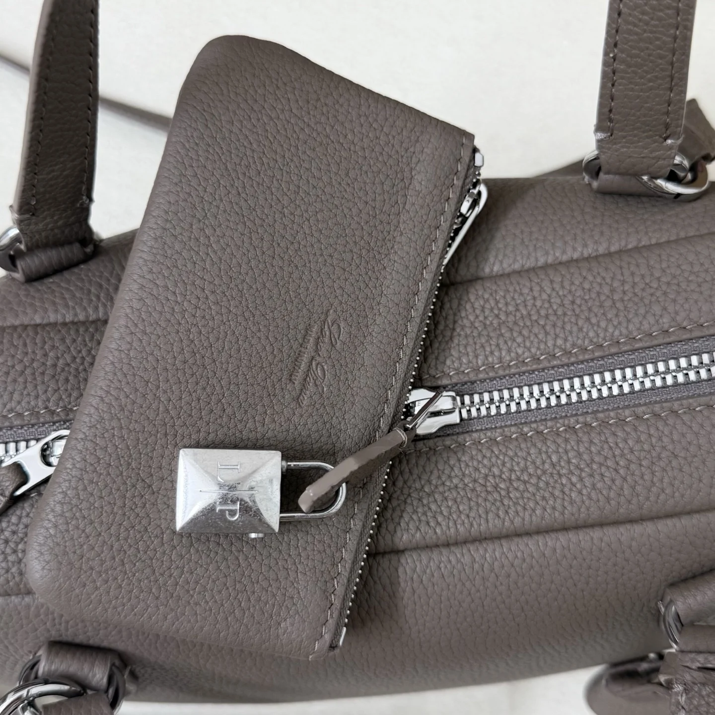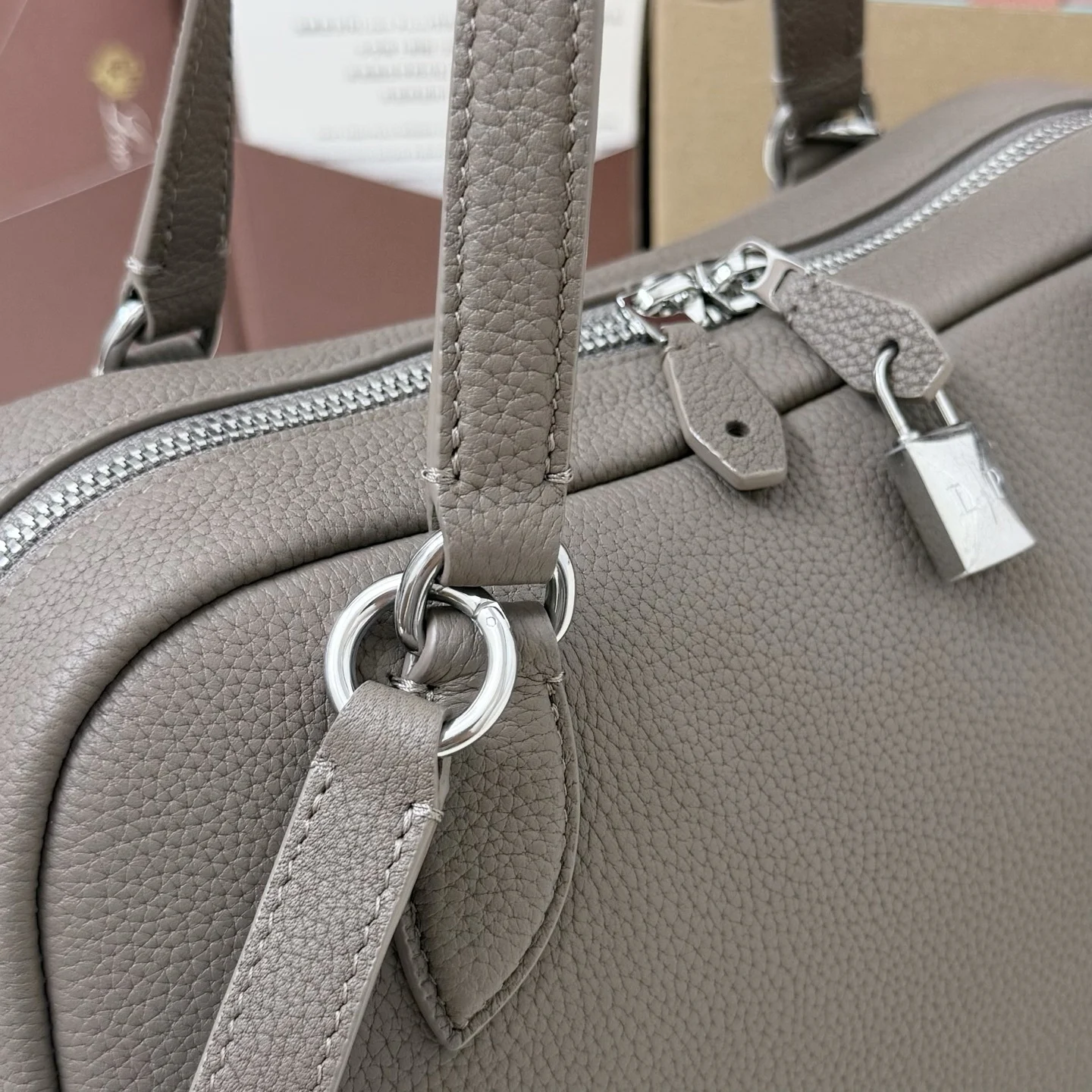 Here presented in a small size, the Needle is a Loro Piana interpretation of the bowling bag, complete with the iconic LP charms. Evoking the Maison’s textile heritage, it is inspired by the bags used to carry knitting needles. It is constructed with soft, sinuous lines, allowing for versatile wear over the shoulder or in hand. Crafted from fine-grained leather with a velvety suede lining, it has a harmonious silhouette and is made with a single piece of leather along the sides.