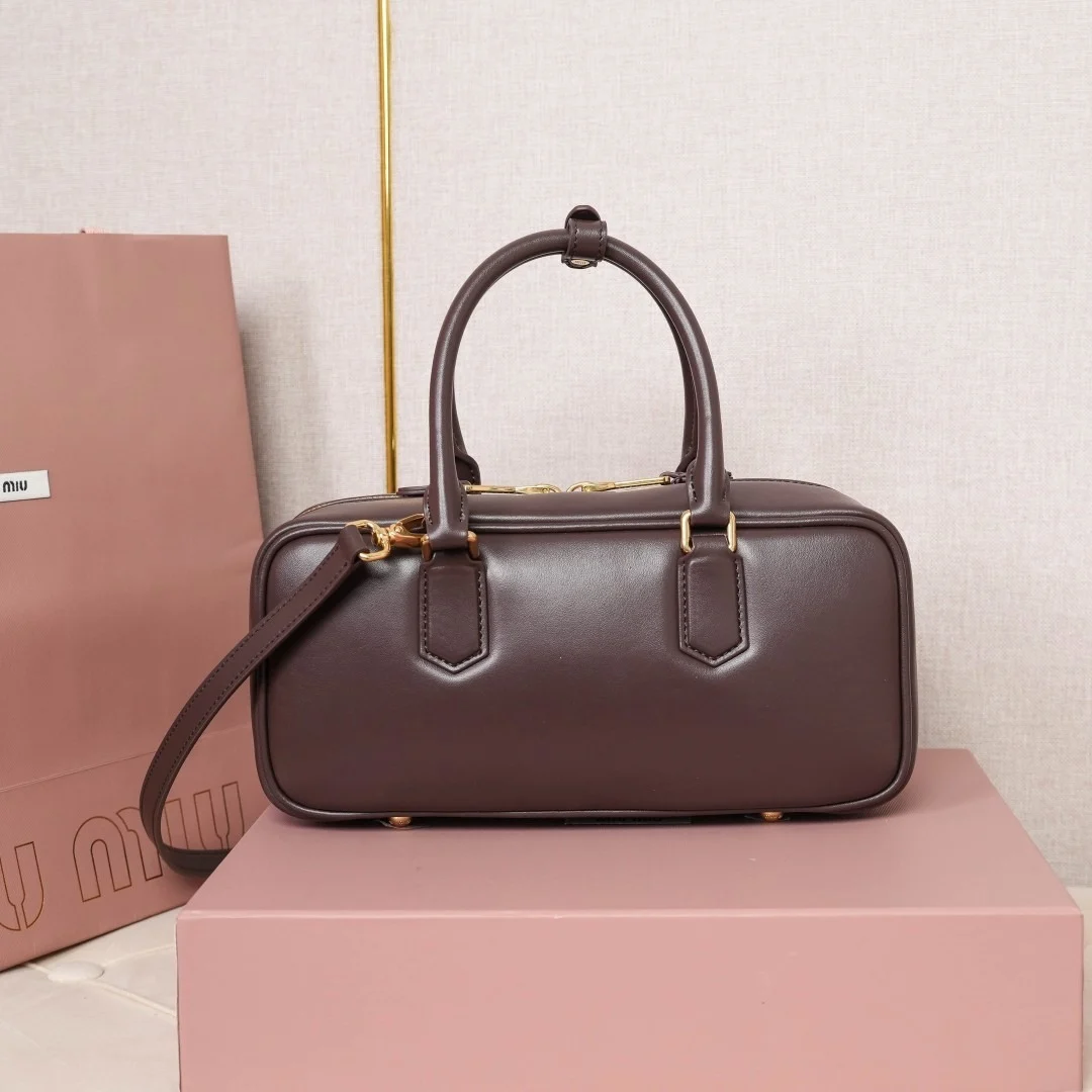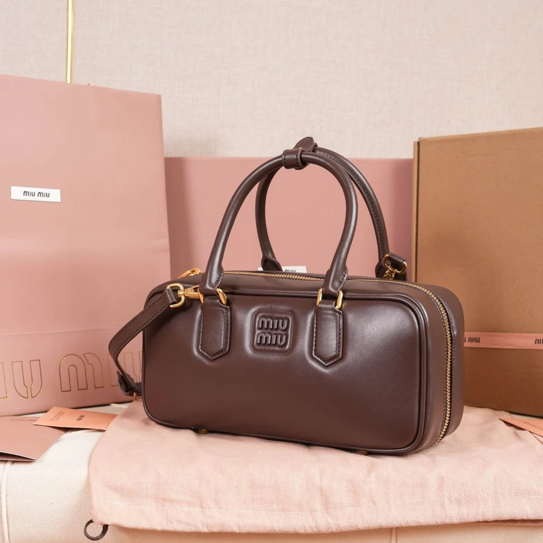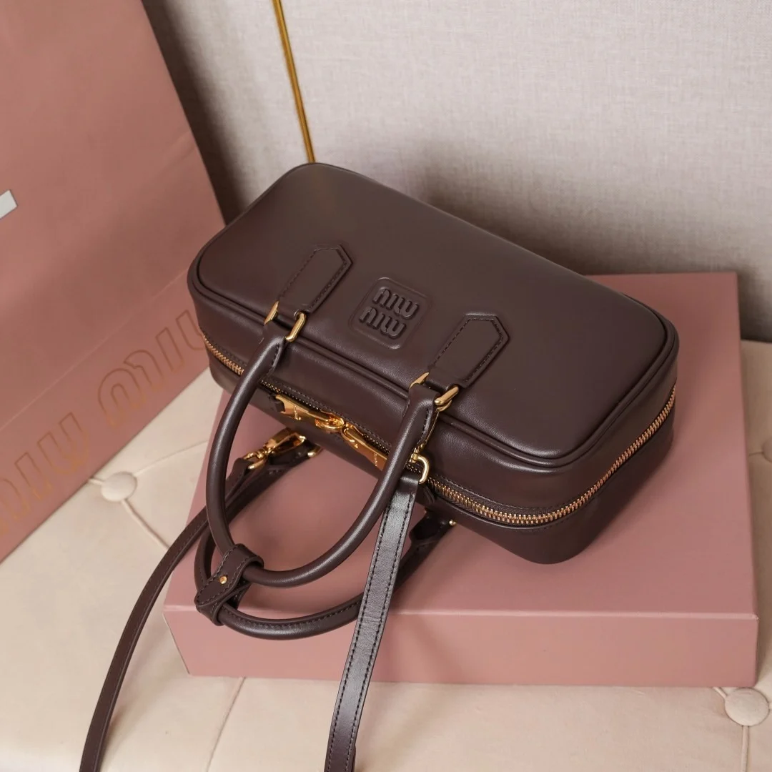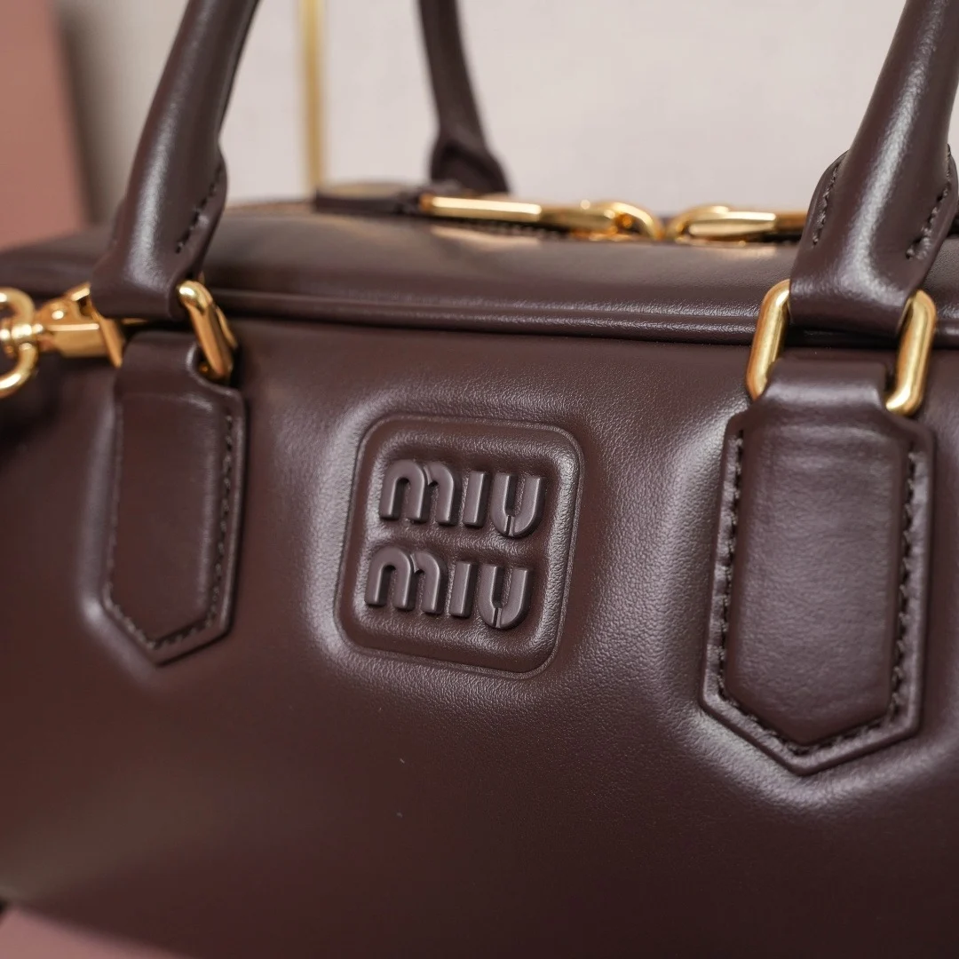 To preserve the quality of this product over time, we recommend that you follow these care instructions: – Handle the product gently and avoid overloading it to keep its shape intact. – Avoid direct exposure to sources of light and heat. – Avoid contact with oils, cosmetics and perfumes. – Store the product in the protective bag when not in use. For any other questions, please contact our Client Service in the “Contact us” section or stop by a Miu Miu store.