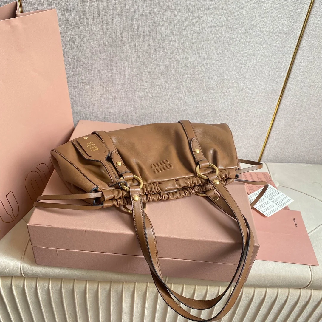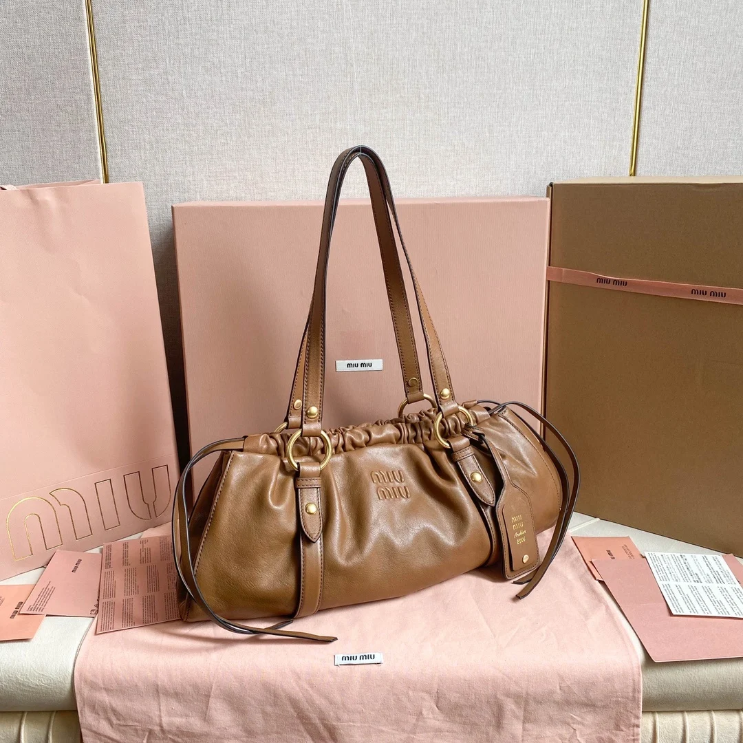 Miu Miu Joie Nappa Leather Bag. Reintroduced from the brand’s 2006 archives, this design features a relaxed, “dumpling-like” silhouette crafted from exceptionally soft, supple leather.