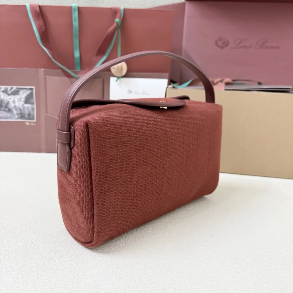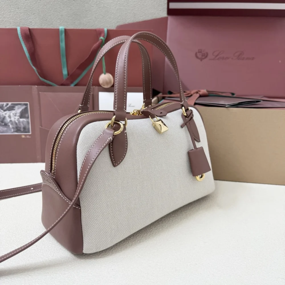 Here presented in a small size, the Needle is a Loro Piana interpretation of the bowling bag, complete with the iconic LP charms. Evoking the Maison’s textile heritage, it is inspired by the bags used to carry knitting needles. It is constructed with soft, sinuous lines, allowing for versatile wear over the shoulder or in hand. Crafted from natural canvas with a velvety suede lining, it has a harmonious silhouette and is made with a single piece of leather along the sides.