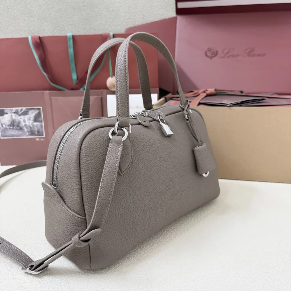 Here presented in a small size, the Needle is a Loro Piana interpretation of the bowling bag, complete with the iconic LP charms. Evoking the Maison’s textile heritage, it is inspired by the bags used to carry knitting needles. It is constructed with soft, sinuous lines, allowing for versatile wear over the shoulder or in hand. Crafted from fine-grained leather with a velvety suede lining, it has a harmonious silhouette and is made with a single piece of leather along the sides.